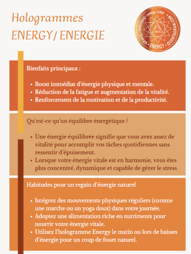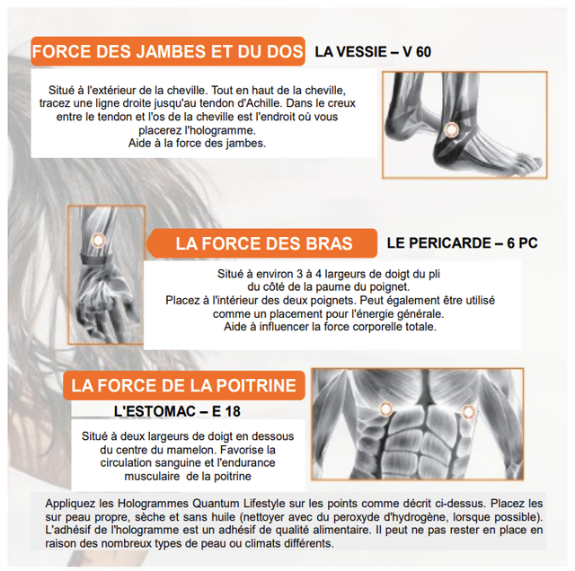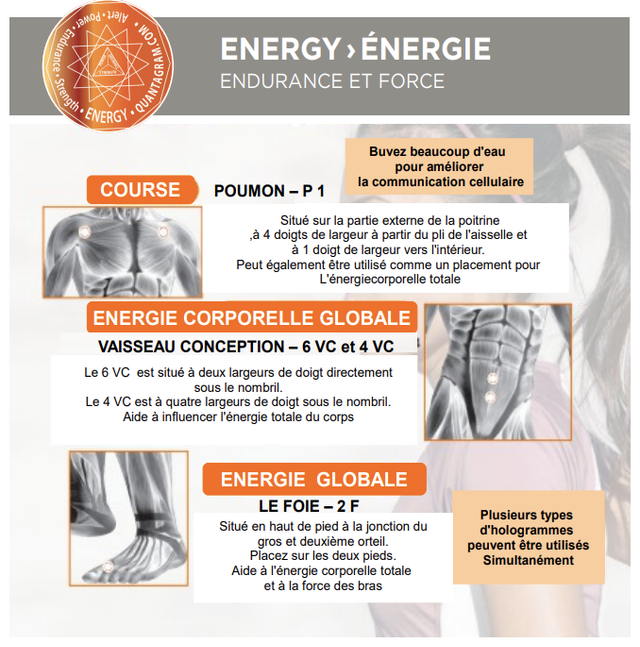 Les Energy QuantaGrams™ sont destinés non seulement au bien-être général et à la vie quotidienne, mais nous avons également inclus des instructions et des placements spécifiques pour les activités sportives. Qu'il s'agisse d'une activité quotidienne, de course à pied, de jogging, de dynamophilie ou de tout autre entraînement intensif, ce produit est fait pour vous.